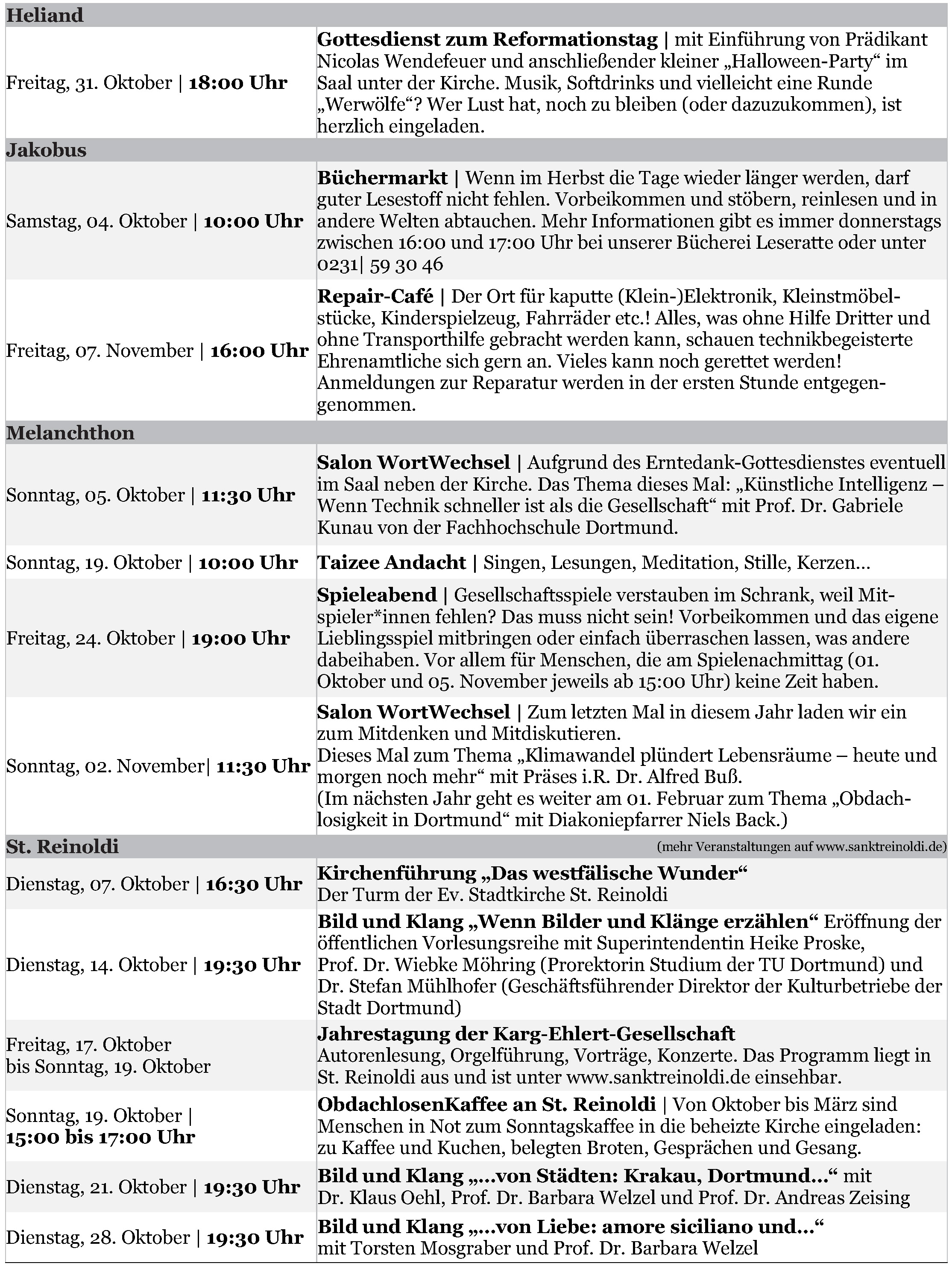 Weitere Termine: Am 6.7. spricht Superintendent i.R. P.G. Stamm über Flucht und Migration. Am 5.10. informiert Prof.in G. Kunau über Künstliche Intelligenz. Am 2.11. nimmt Präses i.R. A. Buß zum Klimawandel Stellung. Immer sonntags, um 11.30 Uhr, in der Melanchthonkirche.